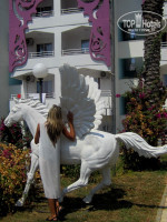 Ближе к теме ..территория отеля просто шикарна. Есть 3 бассейна , один из них с горками . Множество лежаков, которых всегда хватало, как возле бассейна , так и на пляже , во сколько бы мы не пришли . Есть бары , в которых можно уединиться и поговорить о чем –нибудь в спокойной обстановке . Пегасы , ангелы – они повсюду . Отлично украшают территорию отеля, придавая некую воздушность, окрыленность, атмосферу праздника . На территории отеля множество прекрасных мест для фотосессий . Если вы не прихватили с собой фотоаппарат, думаю, вам поможет отличный фотограф Сулейман . Но перед фотосессией обязательно нужен хороший загар, в этом поможет турецкая баня - хаммам . Огромный привет Ахмету, Дуану, Илье . Небольшие температуры позволят посещать хаммам даже тем, кто не может по состоянию здоровья терпеть горячий воздух или не любит его. Советую !Это истинное наслаждение!