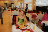 Завтраки: картофель фри, вареный (сыроват), сыры, колбасы (не вкусные), яйца 3 и 5 мин, яичница (желток жидкий, пробовать не рискнула), омлет (острый), томаты под сыром, молоко с хлопьями, йогурты, блинчики, жирные хрустящие лепешки, вафельные корзинки с медом, джемом. Свежевыжатые соки по 1 дол.