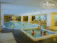 Нижний этаж: бассейн (не большой, хлорированный, но теплый), фитнес зал (беговые дорожки, велотренажеры, всё работает), дискотека (не большое помещение, есть маленькая сцена, столиков 4-5 со стульями и диванчики вместительные по периметру, места хватало всем. Имеется бар: наливают только газировку, пиво или вино. Рядом туалет) С нижнего этажа можно выйти прямо к бассейну.