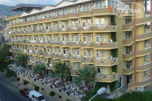 Что сказать, отель потрясающий!!!! 5 корпусов, 2 бара, 2 бассейна, 2 ресторана, центр, до пляжа 2 мин. пешком, всё рядом, до дискотек рукой подать… Питание..это отдельная история! Поварам – респект огромный! Все виды сладостей, арбузы, дыня, алча, апельсины, гриль, индюшка\курица, рыба всех видов, свежие лепёшки (бабушка прям при вас делает), соления, свежие овощи, салатики вкусные, фасоль…Только жаль, что есть совсем не хотелось – жарко слишком…Вот сейчас вспоминаю, и слюнки текут)) Официанты очень вежливые, доброжелательные, никогда не нахамят, грубого слова не скажут)) Попадаются, правда, приставучие, но, если им сразу всё дать понять, жить будете просто в шоколаде)) Вечером ходят «аниматоры» - предлагают за 5 у.е. довезти до «Джеймса Дина» (местная дискотека) и обратно. Это лишняя трата денег, т.к. пешком можно добраться минут за 15-20 – заодно и ночной Аланией полюбуетесь!)) На мой взгляд, самый лучший клуб здесь – Робин Гуд. 4 этажа нереального кайфа! В принципе, все диско расположены рядом, обойти всё не составит особого труда)) А если установите контакты с барменами, сэкономите очень приличненько на напитках)) Макдоналдс недалеко, но цены могут неприятно удивить… Если рискнёте заглянуть в одну из многочисленных лавок с товарами (мы долго не могли этого сделать), останетесь очень довольны – по крайней мере, хорошее настроение гарантировано)) Мигрос – супермаркет хороший, но мы пользовались всеми «удобствами», расположенными чуть ли ни на территории отеля – там всё есть!)) Экскурсии лучше, действительно, заказывать у Джамала – у него всё в 2, а то и в 3 раза дешевле)) Пегас в этот раз слишком замахнулся… Всё о хорошем и о хорошем… А! Был один неприятный момент: при заселении (а ждали мы до 14:00 прилично) нам достался корпус А, да ещё 4 этаж здания, где нет лифта! Мы были, конечно, жутко недовольны, ругались… Причём вместо 3-х местного номера дали 2-х, раскладушку принесли на 3-ю ночь, но она сразу развалилась… Зато прям над нами была крыша, а там такой вид…!!!!! Да и бар у корпусов мне больше понравился – веселее там)) Ну а если главный корпус хотите, тяните сразу ресепшену по 10 у.е.)) Но нам и так хорошо было! Если «повезёт», пообщаетесь с толстым менеджером, который вас оплюет с ног до головы и убьёт бурной жестикуляцией)) Убираются исправно каждый день, сейф в номере, но платный, с водой проблемы возникали… Зато море фантастическое!!!!! Большой привет девчонкам из Новгорода, которые, кстати, обещали нас найти в интернете, всем Набережным Челнам, семье из Тюмени, которая ездила со мной получать «приз» от «анимации» (кожаную кепку))) Анимация, кстати, раз в неделю – «показ мод» местной кожаной фабрики и танцульки)) Все, кто был с нами в это время, пишите мне на почту nightlady2007@rambler.ru ! Нам было ООООЧЕНЬ весело!!!!! Буду ждать!)))