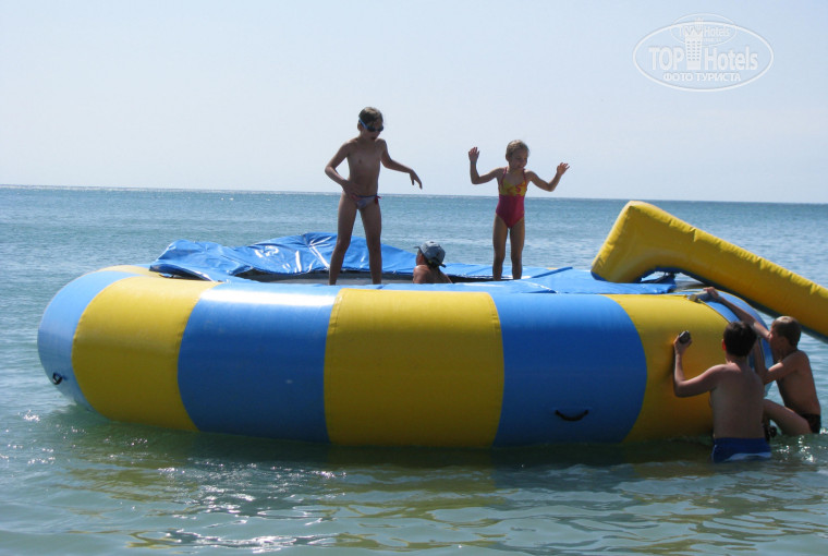 Расположение отеля можно считать как его минусом, так и большим плюсом. Отель расположен на самом краю Святого Власа и добираться от него к центрам туристической жизни далековато. Зато у отеля свой пляж, бесплатные лежаки и бесплатные полотенца. Согласитесь, это в Болгарии могут предложить немногие отели. Проблем с поиском свободного лежака не было ни разу. На море установлен батут и детишек оттуда просто не уведешь.