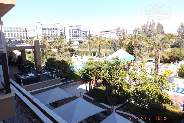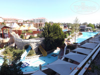 В номере пол, душевая, столешница, пол на балконе, туалетный стол в ванной сделаны из мрамора, как и стены, лестницы, пол во всем отеле, босиком не походишь - холодно. Но н номере лежит палас. Огромная двуспальная кровать, шкаф, стол, тумбочка с мини-баром-холодильником, телевизор-плазма, детская кроватка, небольшой диван, журнальный столик, две прикроватные тумбочки, четыре светильника, огромное зеркало в комнате и на двери в ванную. В ванной шампунь, гель для душа, бальзам для волос, кусковое мыло, ватные диски и ватные палочки, два раза приносили дополнительно шампунь и гель. Большое зеркало в ванной. Душ, краны работают отлично; в мини-баре 2 бутылки воды, 2 бутылки минералки, 4 банки пепси. На столе: чайник, чай, кофе, сахар, сливки. Мини-бар пополнялся водой, так же в любом баре можно было в любое время брать бутилированную воду в любом количестве. Балкон маленький: стол, два стула, пепельница, есть сушилка для белья маленькая, но мы брали с собой веревку и прищепки, так как часто приходилось стирать мелкому. С балкона открывался вид на бассейн и детские горки, было видно море. Имеется антимоскитная сетка у балконной двери и римские шторы на окнах, ну и тюль. Уборка качественная, ежедневная. Ключ электронный с индикатором - горит красный индикатор, если в номере кто-то есть. Имеется звонок. В шкафу много вешалок-плечиков. Слышимость приличная между номерами и коридором, но соседи у нас были тихие.