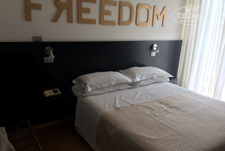 Отель небольшой, всего 30 номеров. Приятный интерьер на первом этаже. На ресепшене нас встретила замечательная русскоязычная девушка Валентина и дала нам ключи от 16 номера (Freedom написано над кроватью). Не знаю, какие там другие номера, точно есть люкс, он больше и дороже, но я писала письмо заранее перед нашим приездом с просьбой, по возможности, выделить нам какой-нибудь приятный номер, мне ответили, что прислушаются к моей просьбе. В результате номер нам понравился, уютный, есть балкон, с которого видно море (до моря кстати идти пару минут, но был еще несезон и мы не купались в море, а только прогуливались по набережной). Мы начитались отзывов, что номера крошечные в отелях в Италии, еле вмещается чемодан, об этом номере такого сказать не могу. Нам места было достаточно. Из предметов интерьера - 2 прикроватные тумбочки, письменный стол, стул, шкаф с вешалками и полками, сушилка/подставка для вещей, холодильник, телевизор(показывает только 1 канал), сейф. Wi-Fi работал хорошо. В ванной комнате душевая кабина, фен (не очень мощный, но высушить волосы можно), также достаточно мыла, гель для душа+шампунь, шапочки, стаканчики.