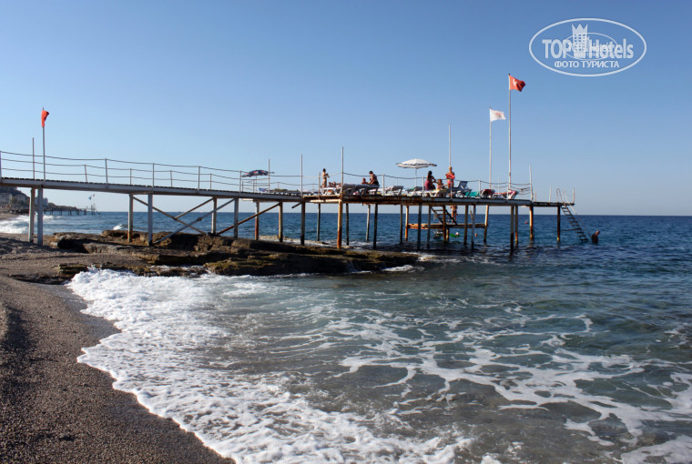 Вход в море только с пирса, потому что берег в камнях. Пляж мелкая галька, не особо благоустроен.