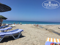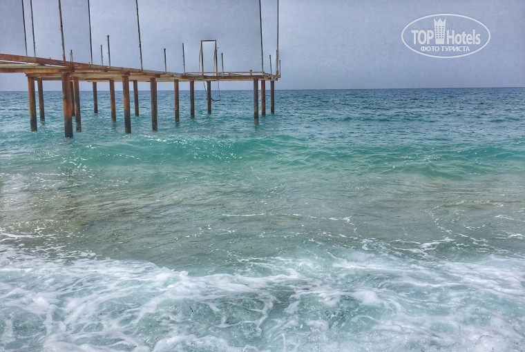 Территория отеля небольшая. Очень уютная территория перед пляжем, красивая и ухоженная, правда не было цветов.., может просто был не сезон. На самом пляже мелкая галька, но вход в море неудобный, тк кругом плиты, об которые спотыкаешься. Когда открыли пирс, большинство людей стали купаться от туда. В начале нашего приезда народу было не очень много, но все лежаки на пляже были заняты, некоторые люди лежали на полотенцах. Мы сразу же подошли на ресепшен и сообщили об этом, после чего незамедлительно принесли столько лежаков, что хватило всем и даже были свободные.