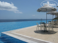 Пляж у отеля галечный, море чистое, но в мае не очень теплое. Купила тапочки для плавания в магазинчике при отеле и не знала проблем. Бассейн тоже не теплый, зато очень чистая вода-проточная. Вода в бассейне и в водопроводе в номерах - минеральная, из источников. Есть теплый крытый бассейн в спа, но там пахнет хлоркой.