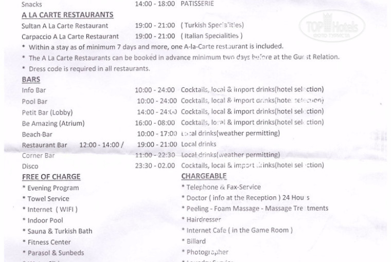 Питание. Для взрослых питание отличное, ежедневно блюда из курицы, индейки, баранины и рыбы, во всевозможных вариантах. Были и голубцы, и перец фаршированный, и блюда из печени. Но маленьких детей накормить проблематично!!!! Не хватало пакетированного фруктового чая, а иногда и кипятка. Вместо горячего шоколада бывало из автомата лилась непонятная жидкость. Соки только в кулере, если это можно назвать соком!!! НЕТ НАЗВАНИЙ БЛЮД НА РУССКОМ ЯЗЫКЕ!!! И вообще нигде не встретите надписей на русском, хотя русских было больше половины отеля. В центральном ресторане много места, но некоторые стулья в разводах и пятнах. Для детей много стульчиков. Из фруктов были: яблоки, апельсины, груши, в последние дни давали арбузы. Персонал очень доброжелательный.