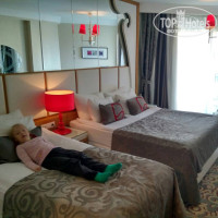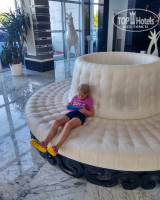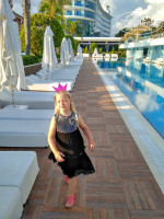 2. Номер. Отель. Территория. Что касается самого отеля мне понравилось, как все устроено. Отель сам красивый. Просто по нему гулять доставляло удовольствие. Катание на лифте особый кайф. Думаю, все кто первый раз приезжают в отель пару раз катаются на лифте с панорамным стеклом до верха и обратно. Номера хорошие, чистые и красивые. Для меня был только один минус. При моем росте 191 см. один элемент дизайна бил меня постоянно по голове. В остальном номера были чудесны. Нас поселили на 3 этаже (на лифте почему-то первый). Если смотреть на море, то номер будет с правой стороны. Единственный минус — это то что территория маленькая и отель зажат между другими отелями. Можете чувствовать запах кухни, ну и шум уборки ресторанов, и прочие шумы. Мы в номере практически не были. Ночевали с 23-30 до 8 утра (дочь), поэтому нас ничего не напрягало. Уборка номеров была каждый день. Что и как убирали не следил. Грязи не видел. Номер повторюсь нравился (жил в № 1310). Территория отеля - маленькая и в этом ее минус и плюс. Гулять по ней не получится точно, но вот как на ней расположили инфраструктуру это очень огромный плюс. Все рядом, все продумано. Два бассейна, детский бассейн, две водные горки, сцена для представлений, два бара (работал обычно только один), здание на крыше которого релакс зона, в самом здании не дорогой магазин, туалет, дискотека, фотограф. Пляж нормальный. На пирсе есть зона где можно загорать, и выходы к морю. Для меня, папы, который отдыхает с маленькой (но самостоятельной) дочкой маленькая территория — это просто находка. Пока дочь в детском клубе, у меня водное поло, потом я играю в игру, дочь идет на горки (а я ее вижу). Купается в бассейне, я иду в бар, но снова ее вижу. Дочь спокойна ходила переодеваться в номер самостоятельно, или спускалась из номера в детский клуб. Каждый решает сам касательно какую выбрать территорию отеля, раньше у меня не было опыта маленьких территорий, я отдыхал в гигантских отелях. Одному можно выбирать любой отель. Но последнее время мы катаемся с дочкой вдвоем, и я не хочу, чтобы отдых вертелся только вокруг нее, а мне доставался по остаточному принципу. И в этом случае маленькая территория отличный выход, когда и я и дочь хорошо отдохнули.