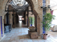 Пройдя влево по дорожке вдоль группы кактусов, вдыхая фитонциды кипарисовых, попадаешь в здание ресторана. Ресторан произвёл приятное впечатление византийским стилем (купола, мозаичные панно), светлыми тонами, спокойной классической музыкой.