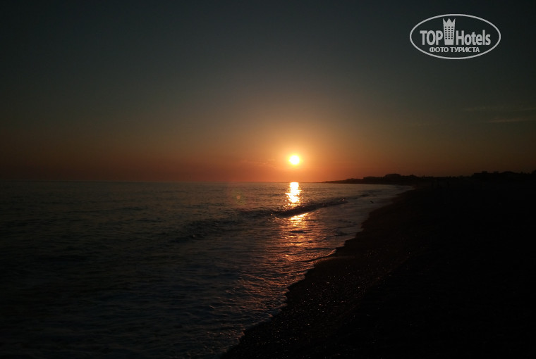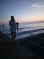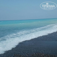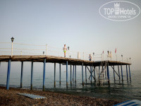 Пляж смешанный, в месте где стоят шизлонги - песок. Дети там делают куличики и строят замки. Ближе к морю начинается галька. Имеется пирс. Сделан из деревянных досок с приличными зазорами. Если, что уроните на нём, скорее всего упадет в море. На пирсе есть две лесенки. Одна к направлению к берегу, вторая на противоположной стороне. Любителей попрыгать и по нырять много.