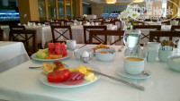 В ресторане всего было много и вкусно.Из мяса в основном курица и индейка. Официанты нерасторопны. На завтраке появляются не раньше 8 час , хотя ресторан работает с 7.