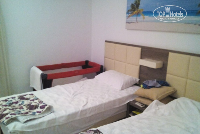 Отдыхали в июне с мужем и ребёнком 3 г. Замечательный отель. Красивая территория, ухоженная. Номера простенькие, но чистенькие, мебель вся хорошая. Нас поселили в бунгало на 2 этаже, хотя брали промо рум (1 этаж). Для ребёнка был манеж с матрасом, нас это устроило, ребёнку места достаточно, спал хорошо там, поэтому просить кровать или раскладушку даже не стали. Убиралтсь ежедневно, полотенца тоже ежедневно меняли. Еда хорошая, можно найти все по своему вкусу. С утра вкусные яичницы с грибами колбасой и сыром, ребёнок уплетал блинчики с шоколадом. Много фруктов - арбузы, дыни (зеленоватые были правда), апельсины, сливы, персики, яблоки, клубнику давали. Много баров. Бассейны чистые, аквапарк для ребёнка супер просто. Мы ходили после сон часа до 17-00. С утра на море были. Пряж хороший, лежаков достаточно. Сначала оставляли полотенца, т.к во многих отелях где была, если с утра не займешь лежак, потом не найдешь. Но здесь много свободных и мы перестали оставлять полотенца))) море первые дни и последний было супер, а потом были волны и мазут ((( ну это по всему побережью Алании, т.к. на пляже Клеопатра так же был мазут. Вообще море супер конечно, когда нет волн, которые приносят всякую гадость. Мороженое кстати очень вкусное, мы с ребёнком ели по 3 штуки в день )))) муж остался доволен алкоголем)))) вай фай был платный, 11 долларов 7 дней, но у нас работал все 10 дней. Качество ну так нормально, по вайберу связаться с родными и в контакте посидеть норм) в общем, отель идеален для отдыха с детьми. Очень скучаем! Спасибо за отдых!