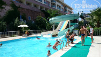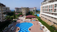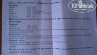 Отдыхали в Titan Garden 7-14 июня 2017 г. В целом отелем мы остались очень довольны, т.к. купили путёвку на 7 ночей на троих за 42 тыс. руб. Соотношение цена-качество получилось отличное. Несмотря на то, что у нас был promo room, мы получили номер с прекрасным видом на всю территорию (2425) и море. Сам номер вполне удовлетворительный, да, мебель немного скромнее, чем в отеле 5*, но абсолютно приемлемая. Балкон большой, на нём стол и два кресла. Приспособлений для сушки белья нет. Ванная комната хорошего размера. В ванной диспенсеры с мылом и шампунем, шапочки для душа и фен (кстати, вполне мощный, с 2-мя режимами). Полотенца меняют по требованию. Уборка ежедневно, мы остались ею довольны. Питание хорошее, были все виды мяса, кроме свинины, хорошая жареная рыба почти всегда, из фруктов яблоки, апельсины, абрикосы(незрелые), хорошие арбузы и дыни. Ресторан расположен на двух этажах, набор еды одинаковый, место найдётся всегда, но лучше, как обычно, приходить в ресторан, когда первая партия отдыхающих уже поела. Еду постоянно добавляют, не бойтесь, что вам не хватит. Официанты работают отлично, быстро убирают освободившиеся столики. Если вы не хотите идти на обед в ресторан, можно поесть в баре на пляже - гамбургеры, картошка фри и т.п. Воду по приезде найдёте в мини-баре в номере, потом в эти же бутылки можно набирать воду в ресторане или в баре. Анимация: в отеле команда аниматоров-турков, с детьми работали две девушки - русская и немка. Вечером детская дискотека, а потом какое-нибудь шоу. При нас приезжали два танцевальных ансамбля (из России), просто отличные. Когда нет приглашённых коллективов, аниматоры сами устраивают шоу с участием публики. Эти шоу не подходят детям и тем, кто не любит юмор ниже пояса в стиле конкурсов на свадьбах. Бассейны и пляж: бассейнов три, один большой (глубина 150 см), рядом бассейн для малышей, второй поменьше (глубина 160 см) тоже с бассейном для детей, а третий - это бассейн с горками, который работает с 10 до 12 и с 16 до 18. До пляжа идти минуты три через территорию, а потом через маленькую улочку (сразу и не поймёшь, что это улица). Лежаков у бассейнов и на пляже в июне уже на всех не хватает. Занимать лежаки у бассейна можно не раньше 8 утра:) Пляж очень широкий, вполне чистый, если вам не хватит лежаков под навесами, можно лежать на песочке на полотенце. Но на солнце или со своим зонтиком. Кстати, пляжные полотенца в отеле только за плату, так что берите свои.