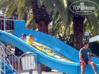 Вокруг рассоложены лежаки и зонтики. Есть как на открытой площадке, так и под пальмами. Ближе к горке стоят лежаки двумя рядами, там тенек, и можно отдыхать с детьми в колясках.