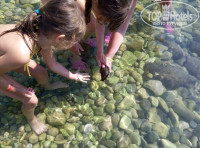 До моря идти ..ну минуты 3, второй пляж чуть дальше. Море чистое, прозрачное и ооочень соленое) Зато к нам заплыла необычная огромная морская улитка (мы ее так назвали), очень милая, и мы с дочками занимались ее спасением) . Никогда не было проблем с поиском места. Вход в море на метр каменистый, зато потом мягкий, нежный песок. Глубина не сразу начинается, так что дети могли спокойно плескаться. На пляже киоск с напитками, кофе, чаем. Мороженое и закуски магазинные, за деньги.