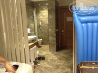 Номер. Про раковину в коридоре и одну прозрачную дверь на туалет и душевую уже писали. Ну что поделать, дизайн такой (сказали "хай-тэк"). В общем, жить можно. Все необходимые принадлежности имеются, полотенца меняются, пол моется, телевизор показывает, свет горит, мини-бар,кстати, заявленного пива не содержал. Для нас это было не принципиально.