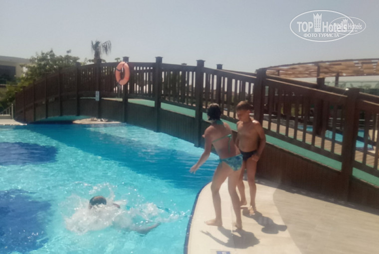 Сам отель новый, все системы работают. 9 бассейнов позволяют даже при 100% загруженности отеля иметь кучу свободных лежаков. Т.к дети постоянно катались на горках мы в основном загарали у этого бассейна. Еще нравился тот, который с мостиком. Проплывать под ним приятно.