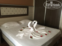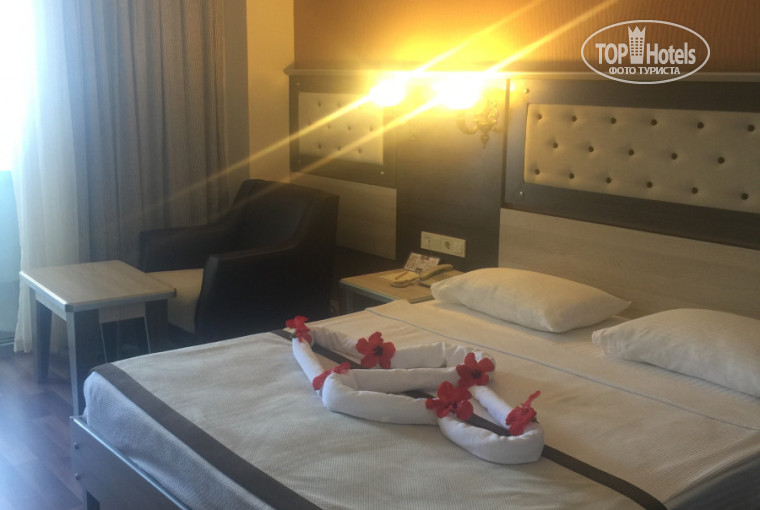 Буквально позавчера вернулись из отеля и пока свежи воспоминания спешу оставить отзыв)) Дорога до отеля, как мне показалось, заняла совсем немного времени, т.к. пейзажи завораживали, а сопровождающий гид не напрягал)) Прибыли мы в отель аккурат по завершению завтрака, около 10:10, что немного огорчило( Встретила нас Нелли, одела браслеты, нас угостили соком, мы заполнили карточку и направились в сторону диванов, чтобы послушно ожидать заселения. Но не тут-то было, не не успели мы сделать и пары шагов, как она нас окликнула "Ребята, вы далеко собрались?" и нам был выдан ключ от номера, логин и пароль wifi, объяснены правила прибывания в отеле. Никаких доплат, вымогательств и тому подобного. Номер оказался в конце коридора с панорамным видом на море. В номере всё работало, постель и полотенца заметно, что не новые, но при этом БЕЛОСНЕЖНЫЕ! Встречали нас в номере сердечки из полотенец и живых цветов, так же номер укомплектован - халаты, гель для душа, шампунь, мыло, шапочки для душа, ватные диски, набор для шитья, влажные салфетки, упаковка бумажных салфеток, губка для чистки обуви и сумка, стаканы в ванной и стаканы рядом с минибаром. Полотенец почему-то было только 4, по 2 больших и 2 маленьких, но на 6 день отдыха добавили ещё 1 полотенце для ног, которого до этого очень не хватало. Постели меняли примерно через день, номер убирали ежедневно, крутили лебедей и т.п., полотенца меняли брошенные на пол(об этом есть объявление в ванной комнате) Сам номер не большой -кровать, кресло, столик, шкаф, 2 зеркала, стул, 1 тумбочка, не совсем понятно размещение торшеров -не 2 по разным краям кровати, а 2 с одной стороны над тумбочкой.