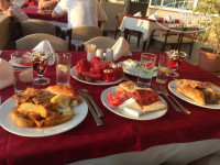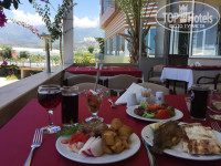 Ресторан! Столиков много, можно без проблем найти место как внутри ресторана так и на улице. Мы предпочитали кушать на открытой террасе, последний или предпоследний столик. Плюсов в этом месте несколько -шикарный вид на горы, свежий воздух, не видны Садом и Гоморра творящиеся в ресторане. Питание отличное и разнообразное, несколько видов мяса всегда! (Курица, говядина, индейка, котлетки), много овощей свежих и приготовленных, рыба, макароны, картошка, много зелени. Из фруктов и ягод каждый день был арбуз, яблоки, апельсины и нектарины, Часто давали абрикосы, но к сожалению зеленые, за это "минус", пару раз были персики, один раз сливы, клубника и черешня.