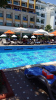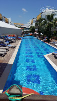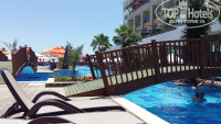 Территория отеля большая. По всей территории огромный бассейн. Еще есть два более мелких бассейна для тех, у кого дети маленькие и бассейн с горками. Шезлонгов и лежаков много, Но люди любят бросить полотенца и при этом полдня отсутствуют. Аналогичная ситуация и на море. Я всегда в отпуске в 8 утра на море. Первый ряд занят почти в полном объеме. К 11 часам часто пляж был заполнен на 100%. Чистота пляжа оставляет желать лучшего. Мусор в течение дня из урн не убирают, песок грязный. Из-за песчаного пляжа и большого количества детей море при входе мутное.