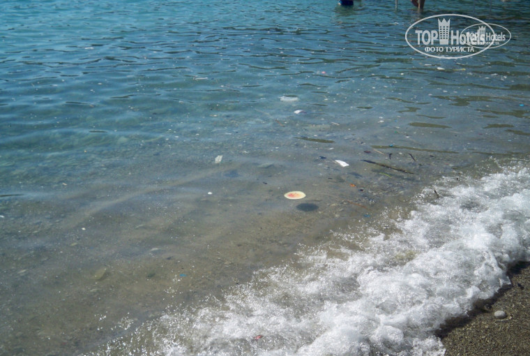 Через два дня нашего пребывания случился небольшой шторм, когда мы утром вышли на море, то просто упали! На берегу и в море было столько мусора, что нигде и никогда ранее я столько не видела, плавало все, начиная от стаканчиков и пакетов, заканчивая флягами, бутылками и палками. На наши просьбы убрать, персонал ответил что уборка моря не входит в их компетенцию, они убирают только то,что вынесет на берег и пришлось отдыхающим самим выносить из моря мусор на берег и только тогда персонал пляжа его убирал. Вообще территория пляжа отеля находится в бухте и туда часто наносит столько мусора, поэтому для персонала это уже привычное дело. Еще один минус пляжа это то, что кроме воды и растворимых цветных напитков с явным химическим вкусом- ничего нет, а так- же для любителей погулять вечером по пляжу у моря пишу, что это не удастся, слева территория перекрыта яхтклубом, справа- охраняемым пансионатом.