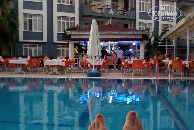 Неделя отдыха в отеле-и жизнь снова играет красками!!!! Тихое уютное место-нет ничего лучше для жителя мегаполиса. Нет эффекта метро-не устаешь от общения. Дворик с бассейном и баром-чудненько.Пальмы;персиковые деревья;гранат;лимон;апельсин-это Турция.Это жарко.Всю неделю утром +37;днем.Чистый бассейн (строго каждый вечер чистили).Можно плавать всегда.Или душ в номере-все работает;вода горячая без перебоев;море -ходили только пешком -20 мин-полезно; фоткались , колорит Средиземноморья из машины не ощутишь)). Кстати,можно прямо в отеле взять велосипеды напрокат!! В общем все обычно, но как-то по-домашнему : номер у нас был небольшой( брала эконом -вариант--ведь только ночевать) ,но чистота-мать порядка!!!смена белья и полотенец раз в 2 дня,,уборку мне предлагали каждый день!! Телек смотрели(есть русский канал),кондей спасал в самую жару; интернет отличный. Холодильник есть-не гудит. Вообще тихое место.Музыка в 22.0 выключалась во дворе и тишина. Ничто не тревожит ваш покой . Здоровый отдых дополнила массажем.В отеле за абсолютно нормальную плату есть массаж. Делают профессионально (мне есть с чем сравнить) Абу и Ахмет. Можно отдельно зоны или общий.Удовольствие и польза ! Делают добросовестно. Рекомендую !!! Вообще персонал очень внимательный и гостеприимный.Они работают!!! Чистят -моют-помогут-без внимания не оставят.С языком : понимают,правда,не все ответят. Мне очень помогал Эмери.Онур решает все вопросы. Абу владеет русским очень хорошо. Вообще отдых удался!За скромные деньги - отдых, комфорт, польза для здоровья!