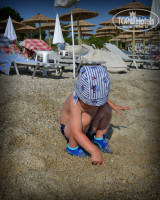 ПЛЯЖ. Честно скажу, с первого взгляда он меня не впечатлил, жаль, но и потом чуда влюбленности не произошло. В 2013 году мы отдыхали в Пиерии, у подножия горы Олимп (Evdion Hotel 4*), да без аренды машины местечко скучноватое, но тот пляж, по сравнению с этим, был просто мечта: немноголюдный, песочек чистейший, вход очень-очень пологий, морских ежей нет. Здесь же ВСЁ не так: пляж песочномелкокаменистый с включениями то ли мелких палочек, то ли высохших водорослей, с морскими ежами, и... достаточно близко от берега набирающим глубину морем. Но главное, что сын вообще отказывался ходить по пляжу, пока мы не приобрели тапочки для купания. Это и не удивительно, мне и самой было неприятно добираться до шезлонга, и каждый раз, наступая и морщась от болезненных покалываний, вспоминать те единичные отзывы, в которых об этом упоминалось, но я не приняла их всерьёз.