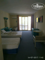 Отдыхали с 07.07.17 по 16.07.17 2 взр. и 3 дет. (6,12,17) принимал Тез тур, рейс перенесли, но мы к этому были готовы. От аэропорта до отеля добирались почти 4 часа, водитель не знал где находятся часть отелей. Приехали в начале 11 вечера и тут началось: попросили накормить детей – отказали, сказали повар ушел и кормить не кому. Ехали в семейный номер, куда изначально нас и отправили (№514).Кондиционер на огромную площадь установлен такой же как и в стандартном номере, окно не закрывалось, зеркало в ванне разбито , на балконе свисали оголенные провода, ковровое покрытие все в пятнах, на потолке трещины, мебель старая и обшарпанная, в тумбочках какие-то дыры видимо ранее стояли колонки, фен перемотан изолентой. Короче беда, но номер просторный ?. Потребовали сменить номер, посмотрели номеров 5-6 и остановились на двух отдельных (№ 512,513), описывать недостатки не стану, так как незначительно отличаются от семенного. По номерам могу только добавить, что они просторные, но за окном очень шумят машины и еще сильнее шумит блок от чилер системы соседнего отеля. Территория отеля это: коридорчик, в котором находится ресепшен и несколько кресел, далее бассейн с одной горкой и бар, там же лежаки и столы, и закрытое помещение так называемого ресторана. Короче все на друг друге. Пляж находится в 5мин. ходьбы через оживленную дорогу.