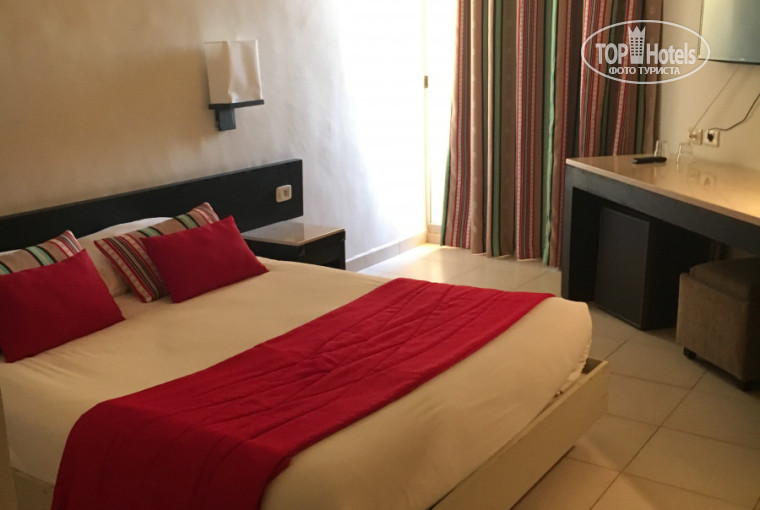 Касаемо номера: нам достался угловой номер на втором этаже с видом на город с просторной прихожей/гардеробной. Если вы едете с маленькими детьми или просто любите рано ложиться, то, наверное, нет смысла просить номер с видом на бассейн и море, потому что вам будет мешать Музыка с дискотеки и прочие активности у бассейна. Сам номер неплохой, хотя и заметно, что отель уже не первой свежести (особенно ванна и туалет) Туалет и ванная комната раздельные. Не знаю, есть ли номера с душевой кабиной, нам достался с ванной. Как уже кто-то писал ранее, фен не очень сильно дует, поэтому, если кому принципиально, берите свой. Кровать была двуспальная, а не две сдвинутые вместе, что тоже плюс. В номере также вполне современный телевизор. У нас с собой была флешка, один раз даже вечером посмотрели с неё фильм. Если у вас есть дети, можно им мультики включать :) Убирались регулярно, воду ставили каждый день. Полотенца почему-то с логотипом TUI внизу, видимо, по наследству достались))) Кондиционер, кстати, работал довольно мощно и днём, и ночью. Видимо, решили эту проблему.