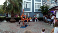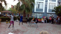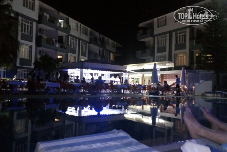 Номер предлагают убирать каждый день, если не нужно, не настаивают, могут просто заменить полотенца, дать туалетную бумагу и т.д. выселение из номера в 12 дня, кушать можно и напитки кроме алкоголя. Т.к мы выезжали в 16.30 из отеля, алкоголь просили принести наших соотечественников. Доплату за номер не принимали по причине большого потока туристов. В отеле в основном турецкие семьи и русские. Вечером небольшая анимация, потом кто хочет пляшет прямо на улице. Столовая на открытом воздухе, территория отеля очень маленькая ( два корпуса с номерами, посередине бассейн с лежаками и бар со столиками- столовая. Курицу дают через день по выдаче, есть соевое мясо, баклажаны запеченные, огурцы, помидоры, салат, зелень, суп-пюре, фри, рис, макароны, два раза давали сладкие пончики, арбуз каждый день, оливки, маслины. Все эти продукты могут быть в йогурте. В общем неделю можно потерпеть. Любители Турции остались недовольны. Много детей, с ними не занимаются. Все включено до 10 вечера. Вокруг много магазинов, мы покупали и ели. Мы приехали уже в 11 вечера нам дали набор еды с завтрака. Вино наливают 2см в бокал, пиво половину, водка 50 грамм, раки также, соков натуральных нет, лимонад и псевдосок из аппарата, вода в кулере без ограничения, правда воняет, видимо из по крана))) Есть услуги массажа 20 долларов, за 25 вместе с хамам в соседнем отеле. Массажист может отвезти за 3 долл до пляжа, обратно столько же, на такси за 5, обратно с пляжа, если есть машины можно договориться за 1 долл с носа. Пляж далеко, но дойти можно. Гулять особо негде только в старом городе. Вообще район, где отель, пустынный, много отелей продается. Пляж общественный, чтобы не ходить на свой мы покупали в ближайшем кафе что-нибудь и бесплатно пользовались лежаками и зонтами. Могу рекомендовать только за такую цену (40 т.р на двоих неделя в начале июля, покупка за неделю до вылета) отель. Персонал небольшой, одни парни, две женщины. По русски говорит только администратор и один массажист. Да, анимация была два раза за неделю. Сзади пасуться верблюды, регулярно ими пахнет и канализацией. Номера тесные( у нас был двухкомнатный) по причине огромной мебели, мыло, холодильник, за шоколад Аленка могут поселить в трехкомнытный, наши так заселись, говорили))) На пляже купаются и собаки. Лодки, скутера, парашюты предлагают, цен не знаю.Пляж в окурках, урн мало, но так другого хлама нет. Заход в воду с основном песок. Не могу сказать что мелко, местами,да, можно идти долго, но не до буйков))). Есть и мелкая галька, с кукурузой на пляже никто не пристает)))), какие то платки предлагают.В магазинах фиксированная цена, естественно не торгуются, на базаре не была, он приезжает по каким то дням, наши говорили, что цены на вещи в сравнении с рублем дешевле