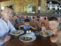 В этом отеле отдыхали 3 ий раз с детьми 3 и 8 лет. По приезду разместили быстро, номера были подготовлены. Перед поездкой читал отзывы и удивлялся, кто то пишет плохое питание, кто то плохое обслуживание, думал за несколько лет что мы не были все поменялось в худшую сторону. Когда приехали все встало на свои места, сервис, питание и все остальное на высоком уровне как и прежде, за время отдыха ни разу не пожалели что вернулись в этот отель. Территория большая и зеленая, есть детский и взрослый аквапарк, огромный детский городок с прорезиненной поверхностью чтобы детишки если падают обходилось без травм. Больше всего он подходит именно для семейного отдыха с детьми, например старшего мы видели только утром и вечером, все остальное время он был занят в мини клубе и с ребятами с которыми он подружился, а вечером после мини диско дети получали грамоты за участия в различных активностях. Каждый вечер в кинотеатре показывали мультики на русском языке, дети постарше пропадали на играх в плэйстэйшен. Все что писали по поводу агрессивных украинцах и т.д. все это чушь, были и украинцы и русские и французы и немцы и казахи, все абсолютно взрослые адекватные люди которые приехали отдыхать никаких эксцессов не было. Еще по поводу лежаков на пляже и у бассейнов, трудности и неудобства создают для себя сами туристы, потому что приходишь к бассейну, а там куча лежаков заняты полотенцами, кругами для плавания и т.д., а владельцев всего этого добра нет, назанимают места у бассейнов на пляже, а сами просиживают где нибудь в баре, каждый день наблюдал картину, часа 2-3 проводил у бассейна,3-4 жезлонга заняты и за все это время никто не приходит, а потом придут заберут вещи и уйдут и получается место занимали просто так. Я несколько раз тупо скидывал вещи которые были оставлены людьми на один жезлонг и спокойно пользовался остальными, поэтому кто собирается в отель не переживайте и поступайте так же. Кстати так ни разу и не увидел хозяев вещей которые занимали место, видимо разбросали шмотки по всем бассейнам и у моря. По поводу питания много писать не буду, всего в достатке и мяса и овощей, из фруктов были арбузы, дыни, яблоки, груши, нектарины, абрикосы, виноград и т.д. лично мне не хватало черешни и бананов, почему то не было.