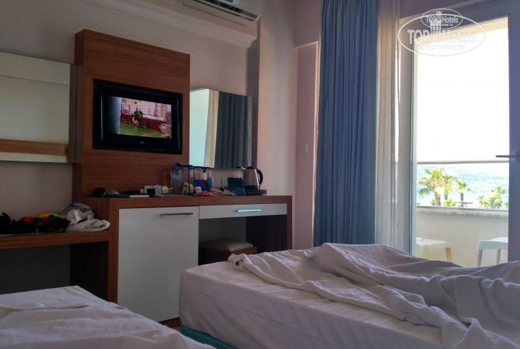 ОТЕЛЬ. В отеле не прочувствовала турецкого гостеприимства, позитива, улыбок....И русский, уважаемые портье, надо учить!!! Возникла проблема с открытием двери, три раза меняли батарейки ( магнитный ключ) , а что с первого раза слабо было сделать? Да... и при этом говорите только на английском... потому как проблема и они не хотят вникать. В отеле много отдыхающих турков, есть и русскоговорящие, немцы, поляки. Между основным питанием перекусы на террасе, у бассейна с напитками. Вай фай только на терассе, лобби, а вот у бассейна у меня не работал. И чудо - 6 дней у меня был вай фай прямо в номере, т.к. на этаже есть вай фай, Для кого? Они не признались))). У бассейна днем редко найдешь свободного места - туристы бросили полотенца и пошли гулять.... А почему не повесить страшные предупреждения со штрафными санкциями?) Анимация - и это в 4* ее почти нет!!! То что они показывали иначе как просто ерунда не назовешь. Твердое 2 !!! Днем вообще тишина, завидовала соседнему Гранд Атилла...Хотя бы для детей какую диско устроили. Бездельники))