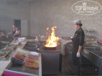 -УЖИН в основном ресторане вполне себе ничего. Мы приходили с семи до пол восьмого. Всегда были свободные, сервированные столики и за грилем стояло не более 3-5 человек. На гриле делали рыбу, курицу, индейку, мясные шарики, два раза был мясной шашлык, несколько раз баранина.