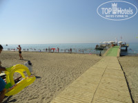 Пляж: отличный. Всегда есть места. Убираются постоянно, даже лежаки. Вход в море почти такой как в Ларе, только гальки на входе чуть больше. Пирс не удобный, закрыт сеткой, не попрыгаешь в воду. Вода со взвешенным песком, слоями с разной температурой, резкий перепад в несколько градусов, но не всегда. Говорят из за речки. Мы туда ходили примерно 800 метров, вода там не выше наверно 19 градусов, не войти.