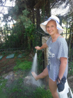 Санузел, как говорится, для сельской местности сойдёт. Закреплённый на стене душ без поддона, пёстрая занавесочка, сливной трап у унитаза потоп обеспечен! Умилила табуреточка для душа и вытяжка "а-ля форточка", расположенная (во всех номерах) рядом с входной дверью. Так что, проходящие мимо номера в полной мере могли насладиться исходящими запахами и звуками. Полотенца (5 штук на 2-их) менялись ежедневно, мыло и шампунь/гель для душа марки "Natural Olive" пополнялись ежедневно.