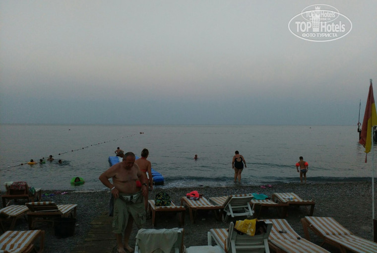 Теперь про пляж!это ,конечно,самое неприятное!территория пляжа ооооооочень маленькая!там всего-то человек на 50 лежаков,ну и может столько же уместилось бы на полотенцах!всё!!!отель большой,людей много,самый сезон и тут такое.....мы нашли выход,плавали все время на матрасе подальше от берега!ну,а на берегу все как селедки в банке!)))))на берегу галька,ходить не очень приятно,особенно,когда она нагревается !а глубже огромные камни,так что запасайтесь обувью для купания!!!иначе ночи будут в порезах,ссадинах и царапинах!бар на пляже-одно название!будка с автоматом,где соки не вкусные!душ так,вообще,обнять и заплакать....ну,нет там 4х звезд!!!!!!