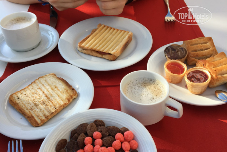 ЗАВТРАК: большой выбор сухих завтраков, но они все "отсыревшие", не хрустящие. Делают омлеты на ваш выбор, колбаса, сыры, сосиски, яичница, пару раз были панкейки, круассаны, рахатлукум, можно сделать себе горячий бутерброд, овощи, фрукты (очень вкусные местные апельсины и грейпфруты), чай, кофемашина, свежевыжатый апельсиновый сок платный - 2.