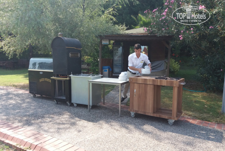 (Однажды за завтраком мы подготовили себе стол. Накрыли. Принесли блинчики, чай, т.е.видно, что стол накрыт.Ушли опять за едой. По возвращении , на нашем столе с краю составлена грязная посуда с соседнего стола.Там сидит женщина с невозмутимым видом, а я знаю, что эта посуда именно с этого стола. Конечно, я промолчала, но было неприятно.)Итак, свободный стол найден.Один человек остаётся его сторожить, другие идут, ну хотя бы за напитками, чтобы как-то обозначить , что этот столик уже занят. Далее кто-то взрослый идёт к стойкам официантов(их много), берёт там столовые приборы, на салфетки(не на грязный стол, как делают официанты)кладём вилки,ложки(их предварительно протираем, они зачастую грязные).Ставим напитки, супы и спокойно идём за едой. Тарелки бывают плохо промытые. Очередей громадных за едой нет. Разве что за яичницей на завтрак и за мясом- гриль на ужин( после 20.00 очереди за грилем нет). Отдельного официанта, раскладывающего приборы нет. Отнёс официант грязные тарелки, этими же руками раскладывает чистые столовые приборы.За чистотой на полу следят, подметают . Лучший внимательный официант-девушка, её столики вдоль окон. Без суеты всё успевает, и напитки приносит, и грязные тарелки моментально убирает. Официанты разные. Бармены все приветливые, без очереди никого не обслуживают. Из ресторана, как и везде, еду выносить запрещено. Но мы выносили фрукты, печенье, булочки в открытую. Никто ни разу не остановил, большой плюс отелю.