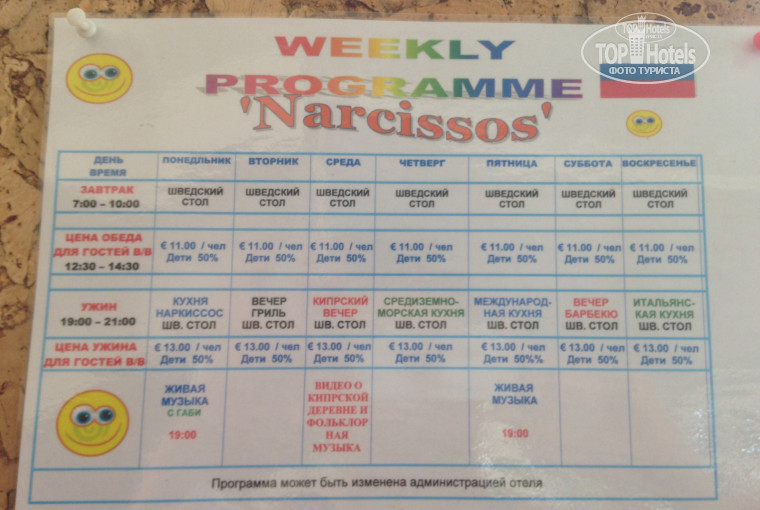 Были на Кипре впервые, вчера прилетели. Отдыхали с 15 по 29 августа. Сравнивать отель могу только с турецкими. В целом, отель неплохой, но на 4 звезды точно не тянет, особенно в сравнении с другими тамошними 4-звездочными отелями. 5 с минусом на рецепшен: там работают посменно 3 девушки. Одна из них-русская дама. Видно, что улыбается через силу, вежлива, но ощущается какая-то нелюбовь ко всем с первого взгляда. Минус только из-за нее. Две другие-милые и добродушные. Анимация в отеле практически отсутствует. 2 раза в неделю живая музыка-в понедельник и пятницу. В понедельник поет ОЧЕНЬ талантливый мужчина, в пятницу-девушка без слуха всякую нашу попсу. По средам-во время ужина включают "фильм о Кипре" под местную музыку. Мне кажется, мало кто понимает, что это такая анимация)) Территория: бассейн хороший, лежаков и зонтиков достаточно. Зелено только там, где домики. Детская площадка очень унылая. Вечером не освещается, газон никакой, горки и качели старые, местами сломанные. И днем именно на площадке очень много ос. Находиться нереально! А для семей с маленькими детьми это немаловажно. Питание: у нас было завтрак+ужин. Один раз мы заменили ужин на обед. Разницы почти никакой. Официанты очень вежливые и дружелюбные. Питание средненькое, скудноватое. Даже мне, всеядному человеку под конец надоели их на редкость однообразные и не слишком вкусные завтраки. Дают каждый день одно и тоже: хлопья кукурузные, овсяные, шоколадные шарики с молоком, яйца вареные и жареные, свежие овощи-огурцы, помидоры, оливки, салат, морковка и прочие, 2 вида сыра, 2 вида "бумажной" колбасы, жареные сосиски и ветчина, фасоль в томате, ну и меняется жареная картошка или кабачки, еще каждый день апельсины и непропекшийся кекс. Чай, кофе. Вечером десерты вкуснее, всегда 3 вида, но уже чай и кофе и вообще любые напитки за деньги. Вечером также всегда арбуз и мороженое. Из мяса всегда что-то рыбное (тушеная, запеченая, кальмары в кляре, рыбные наггетсы), что-то куриное, что-то свиное. гарниры-макароны, не всегда съедобные, картошка в разном виде, рис или ризотто или паэлья, еще бывает лазанья и мусака по разу в неделю. В моих фото есть ужины на каждый день. Интернет в отеле платный и очень дорогой. Сейф и полотенца пляжные тоже платные. Уборка номера-хорошо! Добродушная тетечка убиралась каждый день, через день меняла постель и кучу полотенец! оставляли ей на чай, она нам носила инжир) И еще мы сами собирали инжир на заднем дворе.