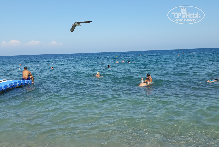 Пляж ,хоть и небольшой - зато свой. До обществееного очень далеко .Когда мы приходили -всегда были места на лежаках . Море- для меня главное счастье, в самый пик конечно многовато народу и детей , но если отплыть подальше- просто замечательно. Слева от пляжа по воде натянуты буйки( там стоят лодки и плаваать нельзя- агентство водных видов спорта), а вот слева все свободно и плыви куда хочешь на как бы территорию соседнего пляжа. Вода теплая и очень соленая. Есть душ на пляже и как бы бар(баром это сложно назвать). Питание мне понравилось (всегда брала курицу(очень вкусная и ножки и крылышки и тп) рис или макароны и свежый салат из помидор и огурец ) . Можно найти свое точно и брать всегда это блюдо.