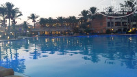 Прилетели с дочкой вечером, после 20.00. По этому наверное заселение у нас было быстрое без всяких доплат. Пока оформляли документы нам предложили поужинать. Конечно к этому времени в ресторане мало чего осталось, но голодными не остались. Персонал давольно приветливый, в грубостях к нам никто замечен не был. Конечно очень большой минус этого отеля это номера!!! Понятное дело что за такие деньги я не ждала распрекрасного номера, но хотелось бы хотя бы что бы все работало и просто было чисто. С этим там действительно проблема!!! Много было недовольных людей и многие уезжали в другие отели. Это можно сделать. У нас в номере без тапочек ходить было нельзя из за плохо вымытого пола. Но эта проблема потом решилась-прорвало унитаз и номер был полностью залит водой. Два дня никто не мог его починить-тупо не понимали они проблему, я просто панически смеялась когда ко мне по несколько раз в день приходили уборщики убирать воду. Наверно думали что это я ее ведрами выливаю на пол. На третий день мне это надоело и я сама нагнувшись над унитазом принялась искать течь. Потом я привела за руку работника и пальцем покпзала на место откуда была течь. Только после этого туалет починили и все стало хорошо))) За то пол был идеально чистым)))) Я раньше отдыхала в хороших отелях 5*, по сравнению с ними, конечно, этот отель рядом не стоит. На ресепшене на диванчики противно садится....они все грязные до безумия!!! Но это же можно почистить....но видимо там на это не обращают внимания. Я не привереда совсем, но на это выходит за все рамки. Если кто туда собирается-сами увидите. В плане питания-не ждите изобилия и разнообразия. Голодными вы точно ходить не будете, но ни более того. Фрукты-зеленые груши, зеленые дыни. Только виноград был ничего такой. Удивило что фиников ни разу не давали.....когда в других отелях в это же время года их было навалом. У нас был ограниченный бюджет, по этому удивлений каких либо по поводу питания у меня не было. Мы просто отдыхали, купались и наслаждались солнышком. Море мелкое очень. Работает аква парк. Анимация наверное хорошая, я просто не любитель ее. Были по вечерам разные развлекухи. Много очень арабов. Когда мы отдыхали их было около 85% от всех отдыхающих, но меня это совсем не напрягало. В виду кризиса стоимость на экскурсии у гида такая же как и на улицах. Так что лучше брать у гида. В магазинчиках торгуйтесь до последнего-отдадут за копейки. В основном отдых понравился, но желания еще раз приехать в этот отель нет)))) Так что если у вас не так много денег и вы готовы на все минусы смотреть с улыбкой и просто отдохнуть без излишеств и даже больше чем без излишеств, то можно разочек и приехать туда :)