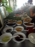 Столовая! Полностью открыта. Есть зона столов в помещении, где стоит еда, но там открыты все двери ооочень жарко. Если не успели к началу приема пищи, то столов не хватает, нужно, либо позже возвращаться, либо ждать. Тарелки практически все со сколами и грязноватые, уж не знаю, как их моют. Разнообразие еды скудноватое. На фото видно, что мясные блюла и гарниры 8 емкостей... и не всегда есть что-то вкусное. Но хватает всего. На завтраки действительно, как сказано в предыдущем отзыве, была все 10 дней только одна молочная каша каждый день, несколько сухих завтраков, овощи, соевые колбасы и либо жареные яйца, либо омлет, сыры и булочки. Из фруктов арбузы, дыни, яблоки каждый день, через день еще не очень вкусные апельсины. Сам персонал столовой действительно шустрый и доброжелательный.
