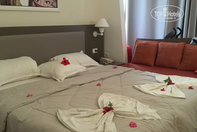 Полетели в отпуск большой дружной семьёй: я, муж, ребёнок 1,5 года и бабушка с дедушкой. Долго выбирала я отель, в итоге остановились на этом, фото красивые, а потом уж начали читать отзывы... Растроилась, но уже было поздно..... Потом расстроил перелёт туда с задержкой на целые сутки, а самое главное минус один день отпуска, но добравшись всё-таки на место - забылось все! Такая красотища!!!!!!! Вид с лобби на бассейн, кругом зеленые пальмы и море необыкновенного голубого цвета. Сразу же пригласили на завтрак. Питание очень разнообразное, выпечка и сладости вкусные, были фрукты в изобилии (арбуз, дыня, виноград и груша), рыба, мясо, горячее первое и самое главное оливки и маслины. Детское меню небольшое, но мой ребёнок не был голодным. Правда из питья ребёнку только чай, соки не натуральные и очень холодные. Бассейн по вечерам дезинфицируют, по утрам чистят, анимационная группа внимательная, море прекрасное, чистое! Песок хрустящий! По утру песок на пляже тоже дезинфицируют. Пляж не большой -но как по мне это большой плюс. Не смотря на то, что в отели были все номера заняты, лежаков на всех хватало: как на пляже, так и на травке или у бассейна (мы всегда находили!). В основном из отдыхающих семьи с детьми и пенсионеры. По вечерам на сцене детская дискотека, развлекательное шоу и дискотека для взрослых. Все до 23:00 и далее тишина. Есть все для людей с ограниченными возможностями и колясок - пандусы и лифты. Номера скромные, но все необходимое есть, убирают хорошо, аромат просто божественный после уборки. Рядом с отелем пару магазинчиков, так что ехать за сувенирами куда-то нет надобности, все то же самое и по той же цене. Переплата на такси выходит. Наши родители были в восторге от компактности отеля, не надо много ходить между номером, рестораном, бассейном и морем. Ребёнок иногда ходил в мини клуб рисовать (с родителями до 4 х лет и старше без) у них интересные программы и разноязычный персонал. Ресторан есть в здании и на улице и отдельный зал для деток, стульчики для кормления по всем залам, но на улице ( пожалуй это единственный минус!) - мухи. Море чистейшее!!!! Мы очень довольны! Возможно были ещё какие то минусы... вроде отсутствия ручки на тумбе или тугой замок на балкон, но это такие мелочи, по сравнению с теми впечатлениями и ощущениями которые может подарить семейный отпуск в Африке на берегу Средиземного моря с белым песком в пальмовом саду!