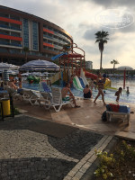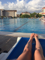 Отдыхали через Анекс Тур, самолет авиакомпании Азур Эир - немного не удобный, поспать сложно. Прилетели из Перми без задержек, на автобусе ехали полтора часа с Анталии (только остановка на технической стоянке была), наш отель был первым на выход. Пошли на завтрак, так как номер в 9 утра нам не дали, отель был переполнен. Предложили заселиться в пятерку за 10 $ в сутки причем без балкона - мы отказались, нас отправили на завтрак. После завтрака дали номер в корпусе А. Видимо самый старый корпус. Но мы замену уже не стали просить номера, так как с маленьким ребенком. Около 11 утра уже заселились. Теперь по порядку. Номер: убирали каждый день, белье постельное за 8 ночей не разу не сменили, в холодильнике при заселении была только вода, нет шампуней в душе, кондиционер работал хорошо, телевизор иногда плохо транслировал. Территория: огромная, множество зелени, в том числе и лимонные деревья, что конечно же плюс. Все чисто и убрано, мусора нет - молодцы при таком количестве отдыхающих. Очень много бассейнов, что детских, что взрослых. Лежаков хватает только у бассейнов. Есть и много детских развлечений. С детьми можно ехать не задумываясь. Питание: можно сказать, что круглосуточное, кроме 21-24.00 - в это время покушать негде нельзя, что не удобно когда с детьми, взрослые могут и потерпеть. В предыдущих отзывах было написано, что питание однообразное. В первые 5 дней прибывания не могла этого понять. Но, потом оказалось, что это действительно так. Ведь готовят одно и то же. И за 5 дней успели попробовать все. Конечно все очень вкусное, тут не спорю. Местных турков отдыхающих в отеле было не много, в основном немцы и русские. Пляж приемлемо чистый, но это уже сами отдыхающие виноваты, что гадят. Как могут чистят. Так же пару дней был сильный ветер и поднялись волны, к берегу прибило со дна камней и водорослей, почистили воду на следующий день. Сам заход в море пологий, чистый. На пляже есть развлечения по активному отдыху. Протяженность пляжа около 250 м, но мест все равно не хватало даже к 10 утра. Хотя народу к этому времени было не много, но все оставляли свои полотенца и лежаки долго были пустыми. Вируса Коксаки мы не наблюдали. Анимация дневная повторялась, день через день одна и та же программа. На ночную мы не ходили, так как ребенок не давал и хотел спать, по этому сказать ничего не могу.