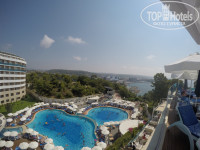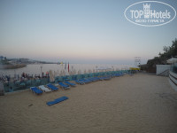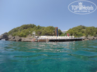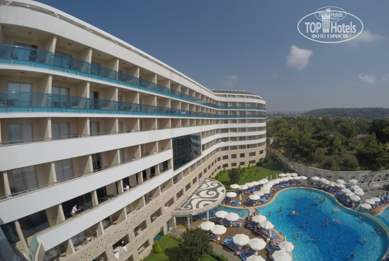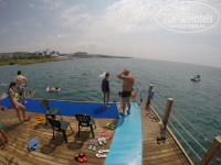Территория оказалась не такой большой, т.к. аквапарк - занимает большую ее часть (он находится чуть в стороне). Я не считаю аквапарк территорией отеля, т.к. в него привозят всех желающих туристов со всех отелей Турции, но об этом чуть позже ;). Так вот, вышли на территорию отеля, которая находится на минус 3 этаже, сразу перед нами два бассейна и один маленький крытый, сразу возле бассейнов бар (круглосуточный), чуть дальше слева еще один. Рядом со вторым баром (работает с 19:00) амфитеатр (там проходят анимация и вечерние развлекательные программы). Проходим бассейны справа дорога вверх в аквапарк (для постояльцев отеля), прямо дорога к лифту на море, чуть налево вниз извилистая дорога тоже к морю. По мне так, на лифте удобней. Как такового привычного пляжа с песочком или галькой в этом отеле нет. Имеется 3-х уровневая платформа. На верхнем - бар (работает с 10 до 16), в котором наливают напитки, с 11:00 можно перекусить (картофель фри, нагеттсы, гамбургеры, салаты). На втором уровне песок с лежаками, душ. На третьем деревянном уровне лежаки в 3 ряда. Дальше пирс, с двумя лестницами в море. Детям было очень весело нырять и прыгать. Если не умеете плавать или не уверены на воде, можно взять у спасателя жилет. Рядом с пирсом плавают рыбки, не такие красивые как в красном море, но все же они тут есть, маски не снимали всё время нахождения в воде ))). Также есть галечный общий пляж. Мы ходили пешком, идти минут 15, если знать куда идти (лучше сразу спросите у охранника , который сидит возле шлагбаума). Чтобы пойти на общий пляж, нужно выйти из отеля через ресепшн и направо, кстати налево можно пройти в аквапарк (центральный общий вход). Если лень идти, можно доехать до пляжа и на автобусе (бесплатно), который ходит по расписанию, остановка за шлагбаумом. Сразу оговорюсь, нам очень!!! не понравился общий пляж, побывав там один раз, мы больше туда не вернулись.