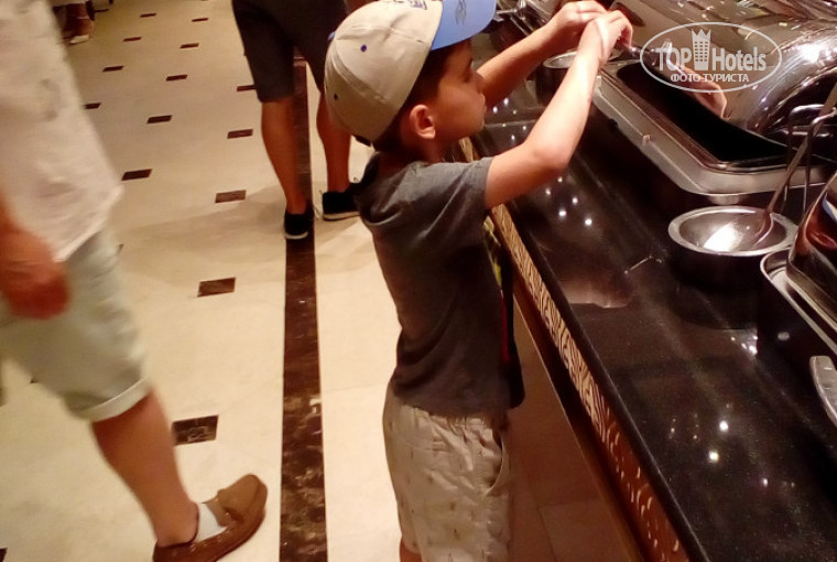 Прибыли мы в 20.00,заселились и пошли на ужин. Кухня - глаза разбегаются,всего не перечислишь!!! Начинаешь вспоминать про жалобы на кухню в этом отеле,хочется сказать,ребят,вы в своем уме??? Это ресторанный уровень и в меню и в подаче. Постоянные национальные ужины,запомнился итальянский,мексиканский. Если вы приверженец правильного питания или диеты,пожалуйста вам все отварное без специй,томатной пасты и остроты. Как можно кухню турецкую назвать пресной? Это тоже вспоминается чей- то отзыв! Обилие специй,приправ,пряностей! Какое хочешь мясо,правда свинины вроде не было,все-таки таки мусульманская страна,но и без нее было мяса предостаточно: баранина,телятина,говядина,курица,индейка,рыба,креветки.больше всего мне нравилась рыба на гриле,вечером она была божественна. Фрукты,море сладостей,мороженое,по утрам апельсин сок,свежевыжитый самостоятельно. Все разновидности кухни не перечислить,это был настоящий праздник живота.отдельной детской кухни нет,но в меню для детей можно выбрать ну очень много всего достойного! Заметила,что все дети мира очень плохо едят,как и мой,ковыряются часами в тарелке)) правда,не было каш,ну и ладно,это не смертельно. Прекрасные оладушки,ели каждый день с джемом,шоколадом,такие воздушные я никогда не ела. Жарятся не на масле,а на специальной плите.