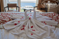 От аэропорта до отеля добирались 1,5 часа с заездами в другие отели. Приехали в отель примерно в 8 утра, нам сказали немного погулять пока номер не готов. Оставив чемоданы на ресепшене пошли осматривать территорию. Вернувшись на ресепшен часикам к 10 были приятно удивлены что нас готовы заселить. Еще больше удивились что нам без всяких доплат предложили отличный номер с видом на море 1316(эти номера были гораздо дороже того что мы оплатили). Мы переоделись и пошли на море, а когда вернулись номер был украшен и стояла тарелка с фруктами и сладостями, игристое вино, лежало поздравительное письмо и торт в виде сердца(очень приятно). На утро предлагали завтрак в постель(бесплатно), но мы глядя на разнообразие еды в отеле от завтрака отказались. Так же, как молодоженам, нам принесли в номер тапочки и халаты(большое спасибо). В номере был сейф(бесплатно),мини-бар(пополнялся каждый день- пиво туборг голд, фанта, кола, спрайт, мин.вода, газ.вода, пит.вода), мыльно-рыльные принадлежности(шампунь, гель, крем для тела, мыло и тд.). Уборкой мы остались довольны, убирались каждый день(пылесосили,меняли полотенца),постельное меняли раза 3 в неделю. На балконе имеется сушилка для белья. Кондиционер в номере шикарный, встроенный в потолок и очень удобный. Шумоизоляция в номере замечательная, окна выходили на амфитеатр, шум нам не мешал спать(может так уставали за день).