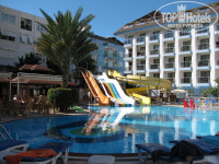 Сам отель имеет компактную территорию. Расположен вокруг бассейна с водными горками. Кстати, горки вполне приличные. У нас продавались номера в корпусе В. Корпус А центральный. В нем находится ресепшн и лобби-бар, а также номера. Из этого корпуса попадаешь на внутреннюю (основную) территорию отеля . Заканчивается эта территория корпусом В, который состоит из двух зданий, соединённых между собой. Внизу находится ресторан-столовая. Очень удобно. Как дома: просыпаешься и идёшь завтракать)