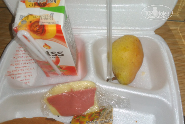 Питание неплохое,выбор довольно большой:курица,индейка-в избытке, телятина, баранина-иногда, рыба-форель,скумбрия и еще какая-то. Салаты, гарниры и т.д.- изобилие, десерты- огромный выбор, фрукты-сливы, яблоки, персики, виноград-нормальные. Груши(см. ранее), арбузы и дыни никакие. Обслуживание в ресторане очень хорошее. Отдельное спасибо официанту по имени Ахмед - большего позитива и доброжелательности трудно себе представить. А вот ланч-боксы-это что-то(см. фото). Сок 200 мл., груша(не съедобная), половинка вчерашней булочки, сыр и колбаса(вместе~15г.-не вру!), джем и СОЛЬ! Пытался объяснить, что такое даже нищим подать стыдно. Бесполезно! Такова КОНЦЕПЦИЯ ОТЕЛЯ !!!