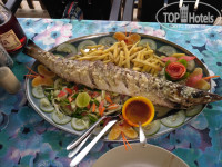Ужин был в столовой, хотя на улице столики стояли, но все ужинали внутри. Ужин- по заказному меню. Меню на английском, но ничего, разобрались. Официанты помогали. Выбор был большой. В каждом разделе по несколько блюд. Супы- два вида, Блюда с мясом (курицей) или рыбой- из 5 блюд не меньше, на выбор, овощное- тоже самое. Порции просто огромные. И, обязательно, десерт. Очень вкусное мороженное.